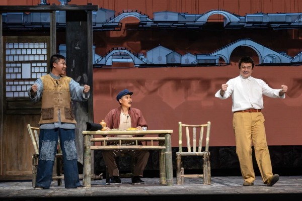 至于属于滑稽戏讲述的“噱头”设置和使用,导演同样做到了自觉地遵循滑稽戏表现和欣赏规律,但又不失于油滑、廉价。特别是此剧中,导演更多恢复了苏州滑稽戏最有特色的唱,因为安排得当,这些唱起到了更好表达内心情感的讲述效果。而且通过唱的形式选择与旋律特色,又使这台戏洋溢出姑苏的气韵风情。