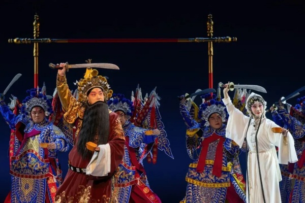 与表演的丰富性相比,作品舞美设计遵循极简美学,不追求大制作。视觉总监高广健从传统戏曲的“帐杆”中汲取灵感,构建城阙、军帐、宫廷、禅庙等场景。“歃血”时,帐杆纵贯舞台,营造出紧张的战争氛围;“就义”时,帐杆倾斜交错,凸显悲壮的意味。一物多用、以虚写实的设计,既保留了京剧写意美学的精髓,又避免了传统舞台的场景单调,让观众充分感受到简约而不简单的艺术魅力。