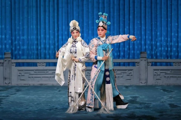 这首先表现在穿戴上。戏曲的穿戴从来不仅是穿戴的事,还涉及人物是谁、怎么演等关键问题。一身素缟、要替夫报仇的东方氏一上场,即令人惊艳:身穿白色绣三蓝花战裙,足蹬白缎绣三蓝花快靴,头扎白绸巾,头顶扎有一个花球。最为惹眼的是,她身前双侧搭白色绣球,这看似无奇的装扮实际上蕴藏着技艺难度的升级。拖曳飘逸的绣球孝条在之后的开打过程中,会随着演员的武打动作飞舞起来,控制不好就会与自己和对手的刀枪缠绕,这无疑增加了演员对身体的控制难度。