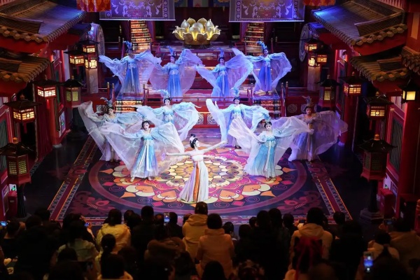 游客在长安十二时辰景区观看表演《霓裳羽衣舞》。新华社记者 邵瑞 摄