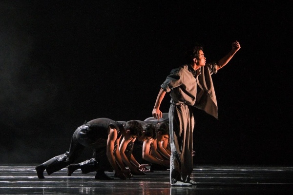 移动的板块装置,将舞台区隔成纵深的区域,一群舞者以充满渴望与力量的舞动,逆流而上、寻光而行;板块装置对物理空间的切割与重组,构建出压抑、阻隔的动态现实环境和心理场域;在背负、推倒、跨越板块装置的互动中,舞者顿挫铿锵的肩背动律、豪迈舒展的身体腾跃,无不诠释着民族危亡之际的奋起与抗争;牺牲,定格在历史的留影中;精神,却如星星之火在大地上燎原。当代舞《觉醒》演绎出蒙古族知识青年在党的思想引领下的精神觉醒,也映照着人类追求光明与解放的永恒力量。