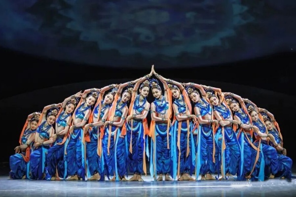 舞台上,舞者呈现手腕向里和向外的绕动,眼神随之“垂眸顾盼”,在身体“三道弯”(东方舞蹈中以头胸、腰臀、胯腿反向扭转形成的S形曲线体态)的基础上,双腿随胯部的回旋轻摆而转换重心。十四名舞者连成一排,身形错落有致,手姿变化万千,整个舞蹈形态温婉柔美,气势又显大气磅礴,不仅展现了壁画中的“大千世界”,更凸显了龟兹舞庄严沉静的核心审美特质。