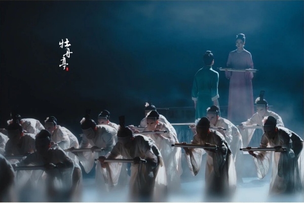 二是新中式审美的强化和升华。自近代西学东传以来,中国传统美学的现代转换一直是一个重要问题。近年来,“新中式”审美思潮的崛起和相应实践,为这项探索提供了一个全新模态。舞剧《牡丹亭》的重要性在于,它既不是复古的,也不是一般的变古,而是从古典出发直接开启出一种生机勃勃的现代性。以该剧的舞美设计为例,它的舞台氛围整体趋于暗淡,显得低调而克制,但这种暗色的背景处理却与剧作的哲学底蕴深度契合。也就是说,该剧的主题是情感性的,但这种情感却奠基于中国人对于阴阳、生死、幽明两界关系的哲学思考。这种思考必然是还原性的,反色彩的,但却为审美化的情色世界的出场提供了基础。以此为背景,光色逐渐从水墨般的画境中浮现出来,首先是水雾的明暗,其次是墙垣的暗粉,再次是群舞的浅粉,然后是杜丽娘纱衣的淡粉,柳梦梅长衫的浅绿,最后一跃而成为牡丹花神浓艳的红。这中间,黑与白、光与影、明与暗的交织似乎构成了宇宙的本相,从暗粉、浅粉、淡粉到浅绿的递进则似乎预示着人性和情感在从宇宙洪荒中逐步升腾起来,到了最后的艳红,无论是情欲性的,还是情感性的,都以极致的色感点亮了该剧的主题,使其达到高峰状态。很显然,这是一种色彩的哲学和美学,化育出灿烂的感性,在克制内敛中迸发出生命的盛放和激越状态。比较而言,如果说回归中国美学的原色,追求含蓄、内敛、协调均是中式或新中式的,那么舞剧《牡丹亭》最后将它带入激越、灿烂状态则是新的创造。这是一种从传统畸变出的现代性,它对目前那些日益陷入平庸的“新中式”审美起到了再次赋能的作用。