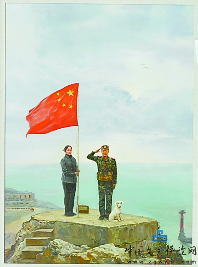 国旗是国家主权的象征。陆地边关,海上边防线,祖国领空……国旗高扬,便宣示着中华人民共和国主权的确立和不容侵犯。在柯如山的油画《雪域巡疆图》中,战士们顶风冒雪跋涉在空气稀薄的青藏雪原,一面鲜艳的五星红旗在茫茫雪山间格外醒目,这一抹鲜红,是整个画面的“画眼”,使得画面色彩对比强烈,把高原战士们不畏艰险守卫祖国边疆的精神无声地传达出来。牟达器、付巍巍、张贯一创作的油画《边境线上活界碑——魏德友》,表现了新疆生产建设兵团退休职工魏德友五十多年如一日扎根艰苦偏远地区巡边护边的感人形象,迎风招展的五星红旗如天边的红霞,照亮了祖国的边疆。在米巧铭根据王继才和王仕花夫妇坚守开山岛、守卫祖国海防线的感人事迹而创作的油画作品《孤岛卫士》中,王仕花手握旗杆,王继才正在向国旗敬礼,海天寂静,五星红旗映照着主人公伟大的心灵,灼灼闪耀。