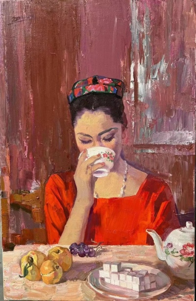 新时代新疆油画更多从微观叙事的视角,捕捉民生温度。越来越多的艺术家选择从家庭生活、街头场景、日常器物中提取艺术元素,于细微事物中展现“翻天覆地的变化”,让作品与大众的情感连接愈发紧密。刘建新《甜茶》系列以“一杯茶”为媒介,串联起从上世纪90年代乡村土房到当代城市楼宇的居住变迁。买尔旦·买买提的《提亲》则用维吾尔传统文化中的鲜亮色彩,通过礼品和人物现代服饰的描绘,暗示传统婚俗在新时代的鲜活延续。这些作品如同视觉人类学的样本,将新疆各族群众的幸福指数具象为可感知的生活细节,映照出党的民生政策如何浸润边疆的每一个家庭。