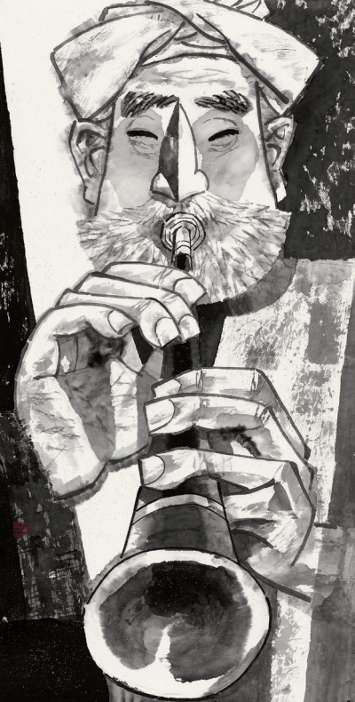 与杨力舟在图式探索上的平面化和构成性不同,王迎春在图式语言上则着力寻求民间美术与现代笔墨的融合。20世纪80年代,王迎春开始探索笔墨图式的结构感,这显然受到立体主义的影响。不过,她将立体主义的结构性表现转换为笔墨的黑白关系,同时又掺入浓淡干湿的渲染和皴法,使之更具中国画特质。比如,《故乡之门》(1986)、《慈母手中线》(1991)、《树荫下》(1999)、《被屈辱的女人》(2002)、“农乐手”系列等作品,在题材上不尽相同,然而其探索路径却是一致的,即通过立体结构的图式和对比鲜明的黑白关系,表现人物性格和画面的主旨。以“农乐手”为题材的系列作品,在语言图式上皆以黑白分割、立体主义的造型加上中国画的笔墨,将农民乐手那种乐观开朗、质朴无华的精神状态表现出来。对此,王迎春认为:“刻画新时代的农民,逼着你考虑用什么样的线条去表现。我想,中国的秤与西方的天平不一样,但都能称东西,里面一定有个原理。黑白的分布就像称东西。”在笔墨语言的探索中,王迎春逐渐形成了具有现代感的写意性笔墨,这是其数十年不断纯化语言的结果。