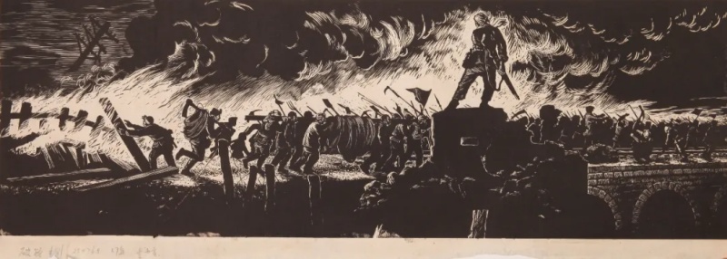 李少言《破路》木刻 25cm×76.5cm 1957年 中国人民革命军事博物馆