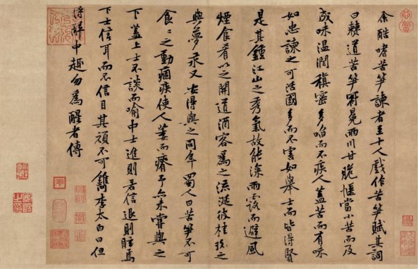《苦笋赋》是黄庭坚54岁时谪居四川宜宾所作。时人多喜欢研究黄庭坚晚年书法的嬗变,却仅停留在笔画之间的变化,且臆说云云。古人的书札,尤其是宋人写意的书牍信跋,书法是寓意的形式,而行文是写意的内容。若仅在这样形式上想究竟出所以然来,往往会事倍功半,又何谈欣赏其书“韵”呢?