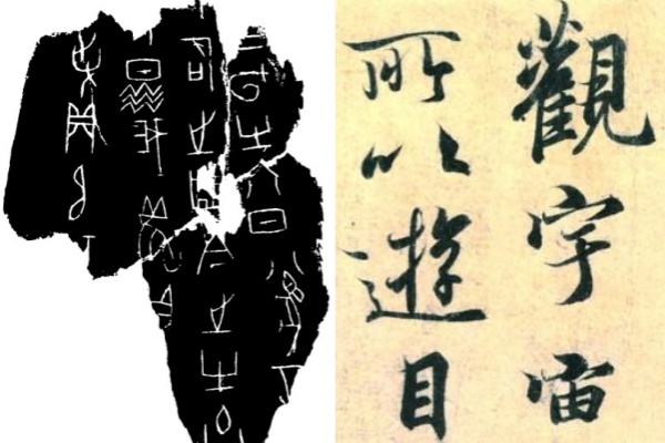 书法的起源,可追溯至新石器时代的陶器刻画符号,如河南舞阳贾湖遗址出土的龟甲刻符,到了殷商,最早成体系的汉字——甲骨文走向成熟。殷商甲骨文最基本的构成单位延承了之前的刻画符号,均由线条组成。不仅殷商甲骨文,两周的书法也基本上是线条的艺术。一直到隶书的演化而出,于是在线条之外出现了多姿多态的点画。此后,从隶书演变而来的楷书,点画更为丰富,是五种字体中最为多姿多样的。行书也有点画,只是不像楷书这么分明。草书就更不分明了,因为草书主要是“以使转为形质”,像王献之、张旭、王铎等书法家笔下的“连绵草”,则几乎是“满纸线条”。所以,篆书与草书是五种字体中含线条成分最高的。