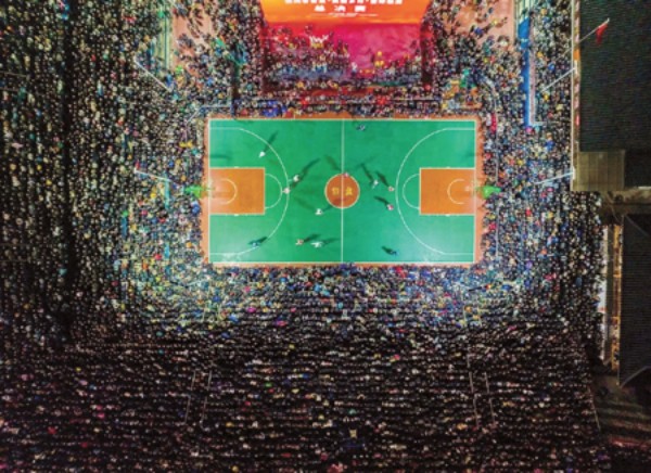 “村BA”是一项源自贵州省黔东南州台江县台盘乡台盘村的篮球赛事,由当地村民自发组织,比赛场地设在村口球场,参赛者以村民为主,极具乡村气息。“村BA”不仅吸引了众多观众现场观看,也受到了全国网友的广泛关注。在第29届全国摄影艺术展览的众多佳作中,摄影作者韩丹的作品《村BA》(组照)以其独特的视角和深刻的内涵脱颖而出。这幅作品不仅捕捉了乡村篮球赛的精彩瞬间,更通过细腻的镜头语言,展现了新时代乡村振兴的生动画面。通过这幅作品,观众可以看到活力满满、热气腾腾、其乐融融的人民幸福生活图景。整体看,作品具有一种均衡的美,体现出一种静中有动的对称,给人以稳定中透出动感、一致中显出活泼的美感。绿色的球场、红色的标语、近乎褐色的人群形成了强烈的对比。作品色彩鲜明,通过点、线、面的不同结合形成的几何图案,是对“村BA”这种生活现象的简化与抽象,显示了摄影者的创造力和想象力。尤其是以点的元素存在的、占据了构图三分之二的人群,在表意上具有无限丰富性。农村群众对篮球运动的参与热情,生动地显示了乡村体育的独特魅力,这恰恰是不断满足人民日益增长的精神文化需要的结果。“村BA”的火爆“出圈”是尊重人民群众首创精神、激发群众智慧和力量的结果,而摄影作品《村BA》是乡村振兴背景下,人民创造美好生活的精彩缩影。