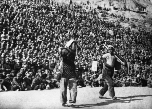 延安文艺运动是中国共产党将民间文艺资源转化为革命动员力量的成功实践。1935年,中共中央到达陕北之后,逐渐认识到边区文艺“如野草闲花似的到处孕生着,成长着,遍地都是翠绿的小草和美丽的花朵,虽不伟大,然而普遍,深入大众”。梆子、秧歌、落子、上党宫调、小花戏、皮簧、霸王鞭等传统民间文艺形式与话剧、歌剧、快报剧等现代文艺形式结合起来,形成了纷繁杂芜、生机勃勃的文艺景观。1942年,毛泽东《在延安文艺座谈会上的讲话》确立了“文艺为工农兵服务”的根本方向,这一纲领性文件不仅重塑了文艺创作范式,更开创了政治宣传与民间文艺有机融合的新路径。