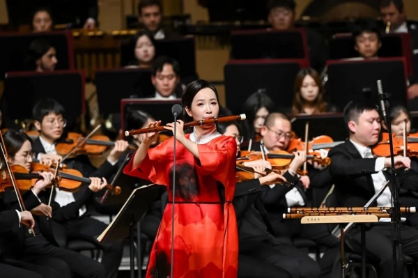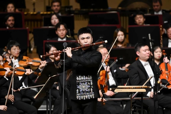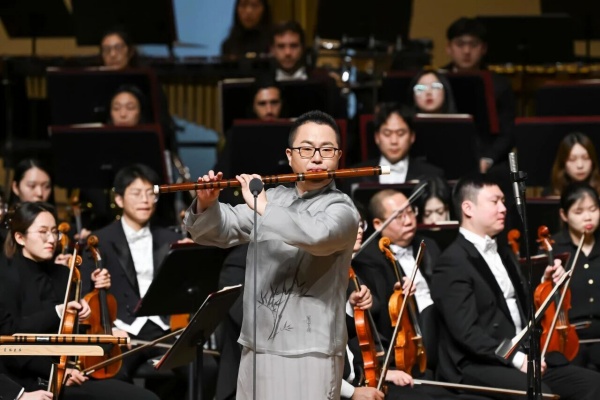 其次,两场音乐会的曲目选择从侧面呈现出一个令人欣喜的现象,当代中国民族管乐创作风格多元、精品众多。曲目既有依托于传统民间音乐素材、充满乡土芬芳的作品,如赵松庭、曹星作曲,李滨扬改编的竹笛与乐队作品《幽兰逢春》,以及赵季平创作的《丝绸之路幻想组曲》等;又有充满诗意和哲理的当代音乐作品,如郭文景的竹笛协奏曲《愁空山》、秦文琛的唢呐协奏曲《唤凤》、郝维亚的竹笛协奏曲《陌上花开》等;还有充满青春和浪漫气息的作品,如李博禅的竹笛协奏曲《热情与冷漠的邂逅》、李博的管子协奏曲《余晖下的背影》等。