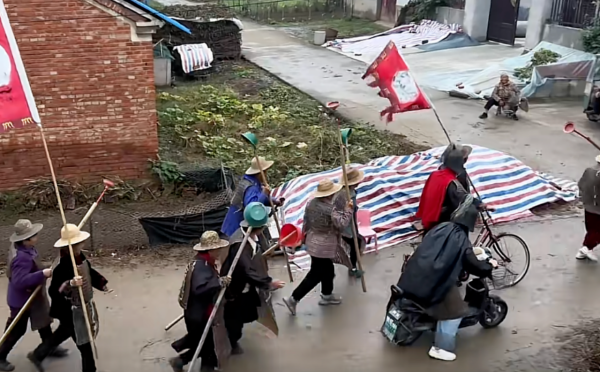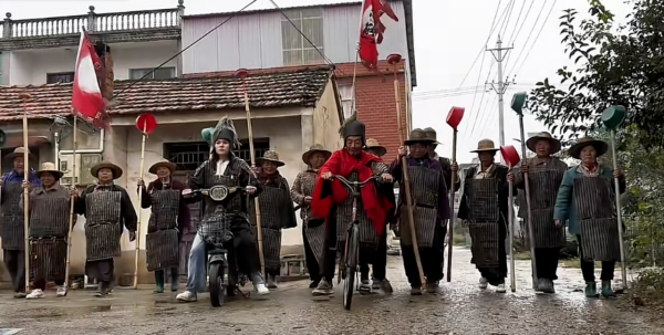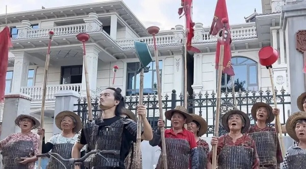 粪勺当戟,凉席作甲,锅盖为盾,自行车、电动车作马,来自安徽阜阳的35岁青年鲍小光,带领村里一群平均年龄70多岁的农村老人,以农具和生活用品为道具,演绎的“土味三国”短剧,意外引爆网络。他们没有专业设备,单期视频成本仅几百元,却创造了播放量数亿次、点赞上千万的流量奇观,也为新大众文艺创作与乡村文化振兴提供了生动注脚。