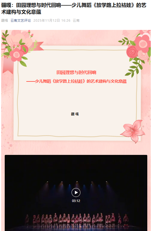 少儿舞蹈《放学路上拉祜娃》好成绩的获取,为少数民族少儿舞蹈创作提供了重要启示。在文化传承层面,作品有力佐证了传统民族舞蹈可以通过创造性转化,成为少儿理解和表达民族文化的有效载体,使民族文化基因在年轻一代中得以延续。在艺术表达层面,其将传统舞蹈语言与现代意象、少儿特质相结合的实践,打破了传统与现代、民族与大众的壁垒,拓展了少儿舞蹈的艺术维度。在时代价值层面,作品以孩童的视角展现少数民族的幸福生活与理想追求,呼应了党对民族地区的关怀与支持,传递了各民族共同团结奋斗、共同繁荣发展的时代主题。