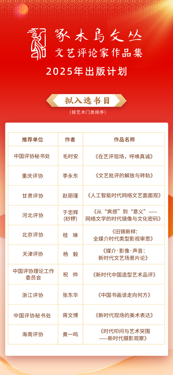 为深入学习贯彻落实习近平文化思想,持续展现新时代新场景的文艺评论风貌,推出文艺评论人才和作品,经中国文联批准,中国文艺评论家协会、中国文联文艺评论中心、中国文联出版社联合启动2025啄木鸟文丛出版计划。经中国评协各团体会员和专业委员会积极推荐,中国评协会员踊跃申报,汇集了一批申报作品。按照评审工作方案,秉持“优中选精、宁缺毋滥”原则,坚守主流价值导向,聚焦新时代文艺场景,我们对申报作品进行了严格规范的资格审查、专家评审和会议研究,拟将10部作品纳入2025年出版计划。现予以公示。