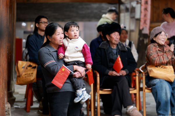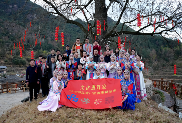 村民自导自演的“村晚”在丽水地区有着四十余年的传统,与村游、村集、村玩相融成趣。2月10日,参加新春惠民演出的几位文艺家,来到青田县北山镇张坪村,参加这里的乡村春晚。文艺家们刚下车,畲家姑娘们便将一条条编织着代表“幸福吉祥”的文字符号的畲族传统彩带围在了他们脖子上,邀请他们加入了“公主巡游”的欢庆队伍。浓浓的年味挥洒在畲族凤冠银饰碰撞的清脆声响中,弥漫在竹竿舞、摇锅、抛茶青等引人共欢腾的民俗活动中。