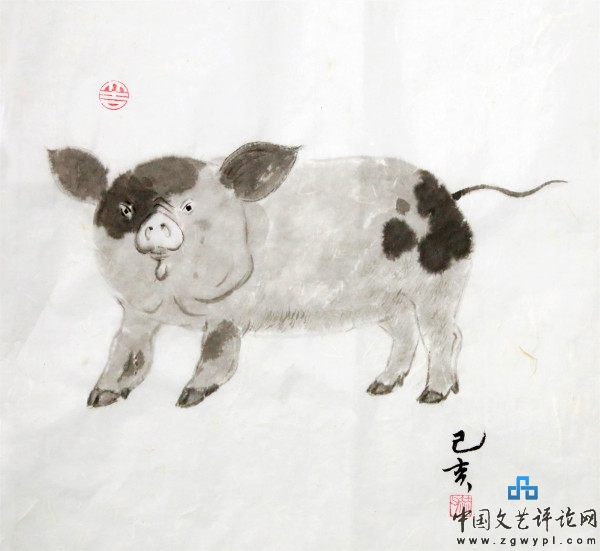 《花猪嗷嗷》描绘一只身体健康的花猪,脑袋壮硕,张着嘴,它停住脚步,警觉地看着周围,马上就要嗷嗷叫的感觉,既有着不屈服的执拗精神,也有灵动生风的喜感,象征着对美好生活的向往。《小猪快跑》描绘了一大一小两张猪,大猪停下脚步,小猪在不停地跑动,大猪仿佛在叫小猪快跑。大猪静态小猪动态,一静一动,一张一弛。两张作品都用水墨完成,淡墨渲染,轻松活波,率性自然,展现出猪的聪明可爱、憨厚的性格特征,也寄寓了吉祥如意的新年祝福。