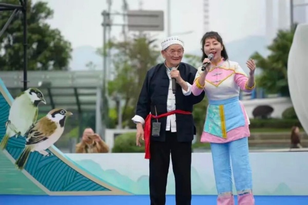 图为木洞山歌非遗代表性传承人喻良华和秦萩玥(右)在“木洞山歌起坨坨”——“麻雀艺评”基层文艺评论活动现场演出。(重庆市文联供图)