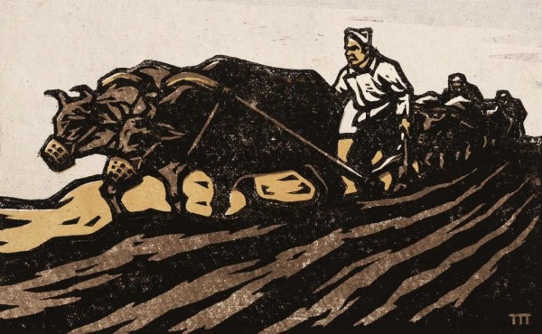 胡一川 牛犋变工队 版画 11.4×18.8cm 1943年 中国美术馆藏