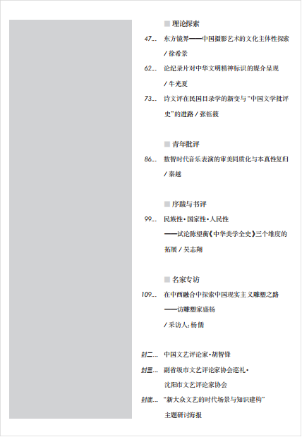 ☆本刊所发文章的稿酬和数字化著作权使用费已由中国文联文艺评论中心给付。新媒体转载《中国文艺评论》杂志文章电子版及“中国文艺评论”微信公众号所选载文章,需经允许。获得合法授权的,应在授权范围内使用,为作者署名并清晰注明来源《中国文艺评论》及期数。(点击取得书面授权)