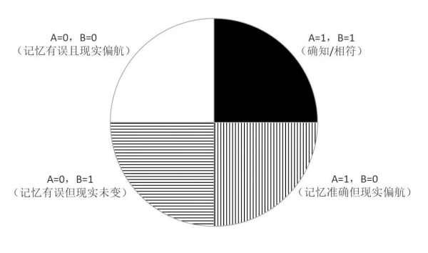 重生小说被认为是典型的“爽文”,“重生”被称为“没朋友的全能金手指”。有学者指出重生小说利用“记忆优势”重新体验、规划人生,实质上是在运用“先知”的金手指,去占同时代人的便宜。但在重生小说中往往出现这样的情节:一次人生的记忆可能并不真实、全面;二次人生中可能会发生许多预料之外的事情。也就是说,一次人生的记忆有准确、错误之分,二次人生中遇到的人和事也存在变与不变的可能。一次人生的记忆(已知)与二次人生的不确定因素(未知)的关系可表示为:C=A∩B。其中,事件A:一次人生的记忆准确;事件B:二次人生的人、事、物不变;事件C:记忆确知;以上事件成立时值为1,不成立时值为0。从概率上来看,如果一次人生的记忆准确和二次人生中的人、事、物改变的概率为二分之一,且两件事独立分布,既有记忆与二次人生发展相符的情况仅占四分之一(图1)。在此基础上,重生小说中的关键情节可抽象为“记忆断言—现实反馈”的事件对,构成四象限:1.A=1,B=1(确知/相符);2.A=1,B=0(记忆准确但现实偏航);3.A=0,B=1(记忆有误但现实未变);4.A=0,B=0(记忆有误且现实偏航)。