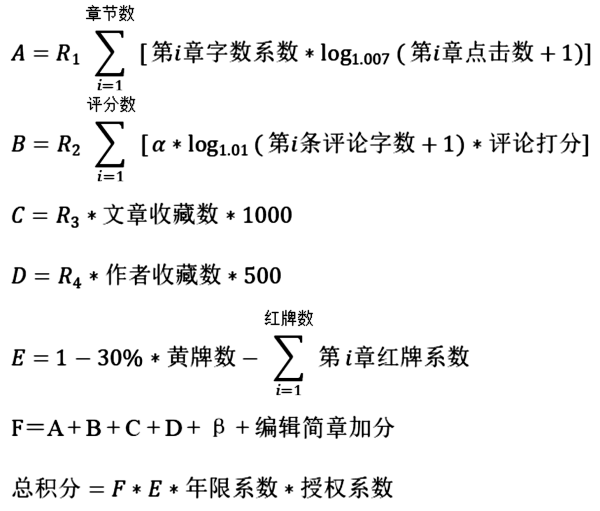 图3 晋江文学城新版积分公式(说明:A为字数与点击部分分数;B为评论部分分数;C、D分别为文章、作者收藏部分分数;E为惩罚系数;β为鼓励创作积分。)