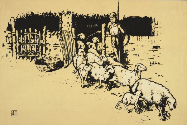 杨先让:1952年,我从中央美术学院毕业后,被分配到刚成立的人民美术出版社从事编辑工作。不久后,我进入创作室当创作员——出版社有两个创作室,一个由古元负责,一个由沃渣负责,古元和沃渣都是版画大家。当时,人民美术出版社主办的《连环画报》给我派了任务,去农业合作社体验生活,创作反映农村夏收场景的组画。在位于河北饶阳的耿长锁农业生产合作社,我画下了一幅幅表现农村生活的作品。其中有一幅作品,描绘的是把羊放出圈的场景,我觉得特别适合以黑白色来呈现。于是,我决定拿起刻刀,做一件木刻版画作品。那时我还没有用过刻刀,也没有人教我,我就一点点尝试,遇到困难就慢慢琢磨着解决,最终刻出了版画《出圈》,没想到这个作品发表后就获了奖。就这样,我又刻了第二件、第三件……慢慢地,就有人称我是“版画家”了。
