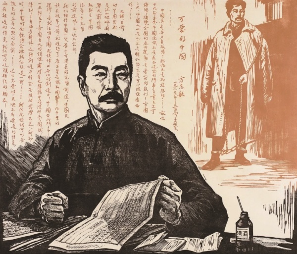 《鲁迅与〈可爱的中国〉》这幅作品创作于1976年,因为我很崇拜鲁迅,所以就刻了《鲁迅与〈可爱的中国〉》,作品以鲁迅先生的肖像为主体,画面背景是方志敏的文章《可爱的中国》。这件作品我刻了很久,主要是一个个文字特别难刻,文字是小楷行书,刚开始时一天也就能刻四五个字,后来刻熟练了一天能刻二三十个字。不过也无所谓,那时候没人催,就慢慢刻吧。在创作这件作品时,我专门到荣宝斋学习了中国传统雕版技法,并将其运用到我的创作中。这是中国传统技法,和西方的刀法不同,以前没人这么刻过,而刻出来后也像写出的字一样,很有味道。我想在作品中表现鲁迅的精神面貌,《可爱的中国》这篇文章和鲁迅先生的气质也相得益彰。这幅作品问世后反响非常大,直到现在还在国家博物馆展出。