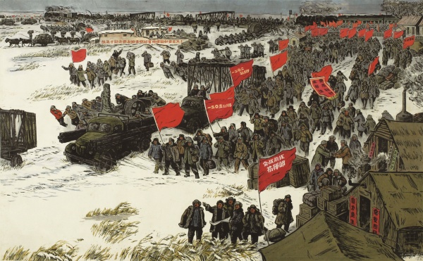 1950年12月,中央美术学院学生为欢送参军同学演出,右三为杨先让