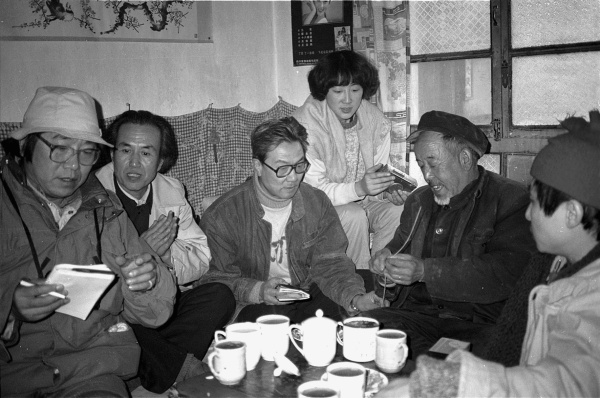 1988年,杨先让(左三)、杨阳(左四)在青海皮影专家刘文泰家中访问